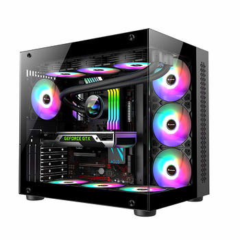 마이크로 ATX 파노라마 뷰 게임용 PC 케이스 미드 타워 2X120mm ARGB 팬 사전 설치된 프레임리스 강화 유리 측면 패널 스톡